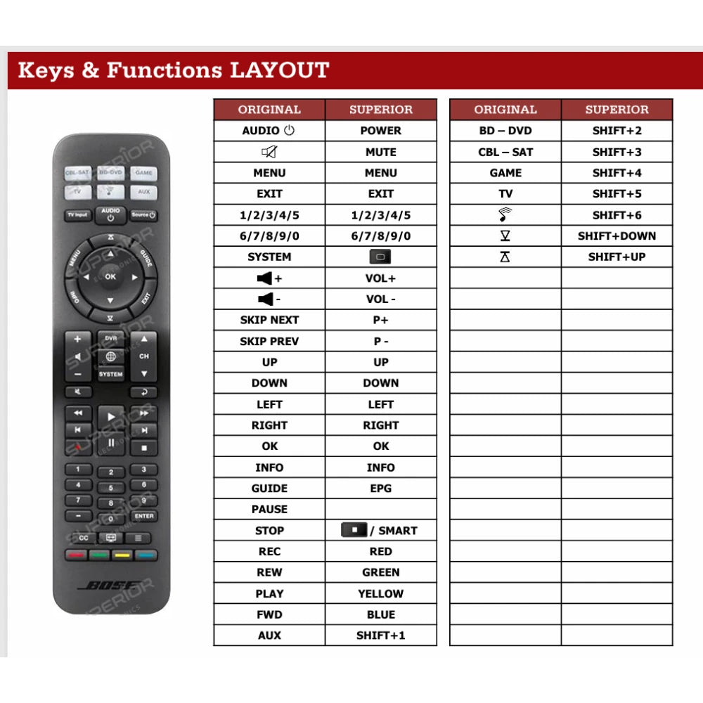 Darüber hinaus ist dieses Modell möglicherweise auch mit weiteren, hier nicht explizit aufgeführten Bose-Geräten kompatibel. Bitte beachten Sie: Sie erhalten eine hochwertige Fernbedienung der Marke Superior, nicht das Original des Herstellers. Die genaue Belegung entnehmen Sie bitte dem detaillierten "Keys & Functions LAYOUT"-Bild in der Produktgalerie.