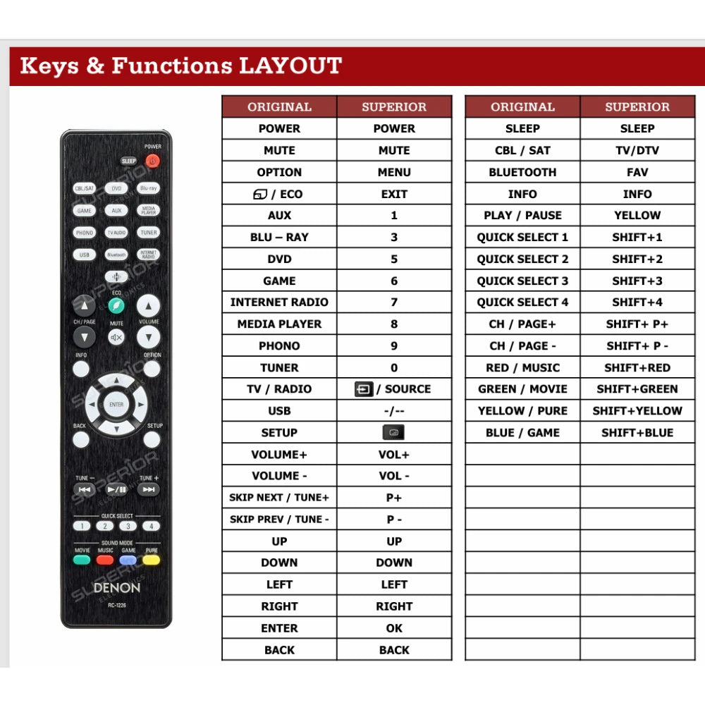 Darüber hinaus ist dieses Modell möglicherweise auch mit weiteren, hier nicht explizit aufgeführten Denon-Geräten kompatibel. Bitte beachten Sie: Es handelt sich um eine voll kompatible, vorprogrammierte Ersatzfernbedienung, nicht um das Original des Herstellers. Die genaue Tastenbelegung, falls sie von Ihrem Original abweicht, entnehmen Sie bitte dem detaillierten "Keys & Functions LAYOUT"-Bild in der Produktgalerie.