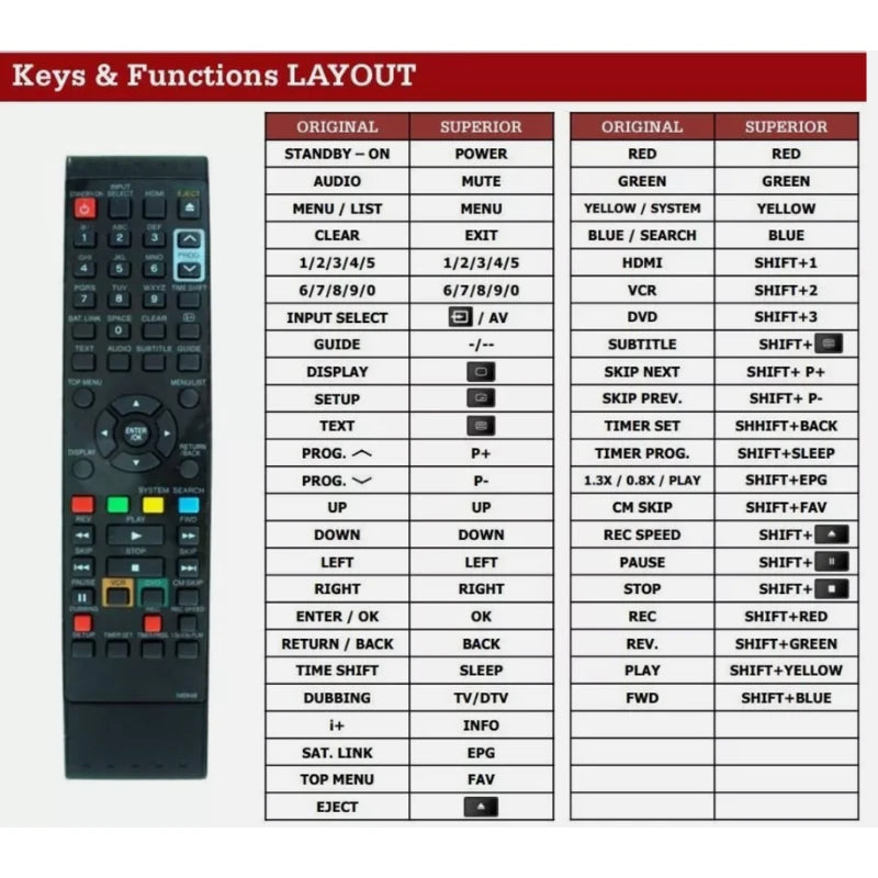 Der größte Vorteil ist die kinderleichte Handhabung. Im Gegensatz zu Universal-Modellen entfällt die Suche nach Codes oder das Lesen komplizierter Anleitungen. Legen Sie einfach Batterien ein, und sie ist sofort mit Ihrem Funai-Rekorder verbunden. Alle Funktionen, die Sie vom Original kennen, sind vollständig verfügbar. Auch wenn einige Tasten anders beschriftet sein mögen, ist die Funktion dahinter identisch. Die genaue Belegung entnehmen Sie bitte dem detaillierten "Keys & Functions LAYOUT"-Bild in der Produktgalerie.
