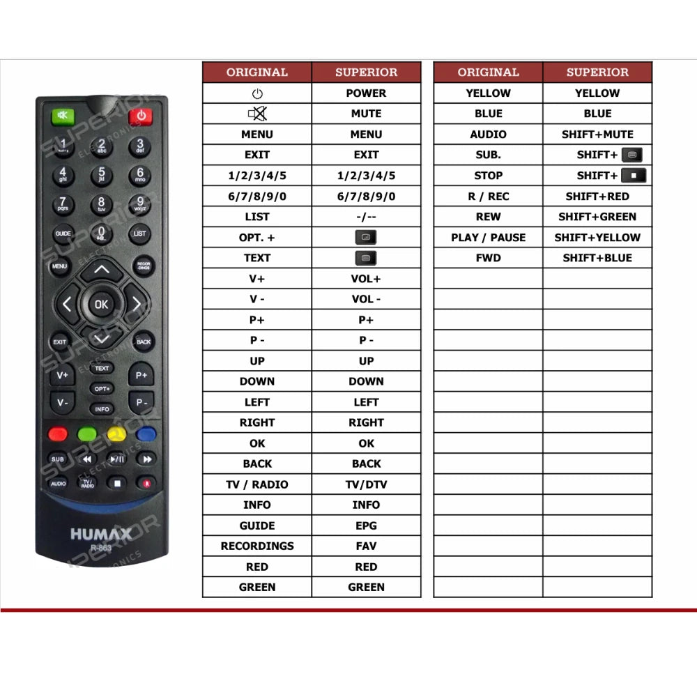 Ist die originale Steuerung (Modell R-863) für Ihren Humax Sat-Receiver defekt oder verloren gegangen? Dieses Modell wurde als idealer Ersatz entwickelt und ist vollständig kompatibel mit den Modellen: Humax TN8000HD und TN8000.