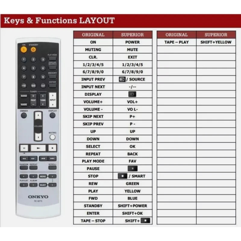 Der größte Vorteil ist die kinderleichte Handhabung. Im Gegensatz zu Universal-Modellen entfällt die Suche nach Codes oder das Lesen komplizierter Anleitungen. Legen Sie einfach Batterien ein, und sie ist sofort mit Ihrem Onkyo-Verstärker verbunden. Alle Funktionen, die Sie vom Original kennen, sind vollständig verfügbar. Die genaue Belegung entnehmen Sie bitte dem detaillierten "Keys & Functions LAYOUT"-Bild in der Produktgalerie.