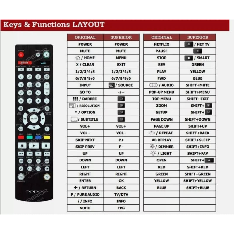 Ist die originale Steuerung für Ihren Oppo BDP-95EU Blu-ray-Player defekt oder verloren gegangen? Dieses Modell wurde als idealer Ersatz entwickelt und ist vollständig mit dem Oppo BDP-95EU kompatibel. Darüber hinaus ist dieses Modell möglicherweise auch mit weiteren, hier nicht explizit aufgeführten Oppo-Geräten kompatibel. Bitte beachten Sie: Sie erhalten eine von uns speziell für Ihr Gerät programmierte, hochwertige Fernbedienung der Marke Superior, nicht das Original des Herstellers.