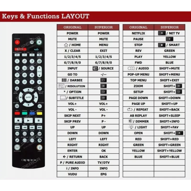 Ist die originale Steuerung für Ihren Oppo UDP-205 4K Ultra HD Blu-ray-Player defekt oder verloren gegangen? Dieses Modell wurde als idealer Ersatz entwickelt und ist vollständig mit dem Oppo UDP-205 kompatibel. Darüber hinaus ist dieses Modell möglicherweise auch mit weiteren, hier nicht explizit aufgeführten Oppo-Geräten kompatibel. Bitte beachten Sie: Sie erhalten eine von uns speziell für Ihr Gerät programmierte, hochwertige Fernbedienung der Marke Superior, nicht das Original des Herstellers.