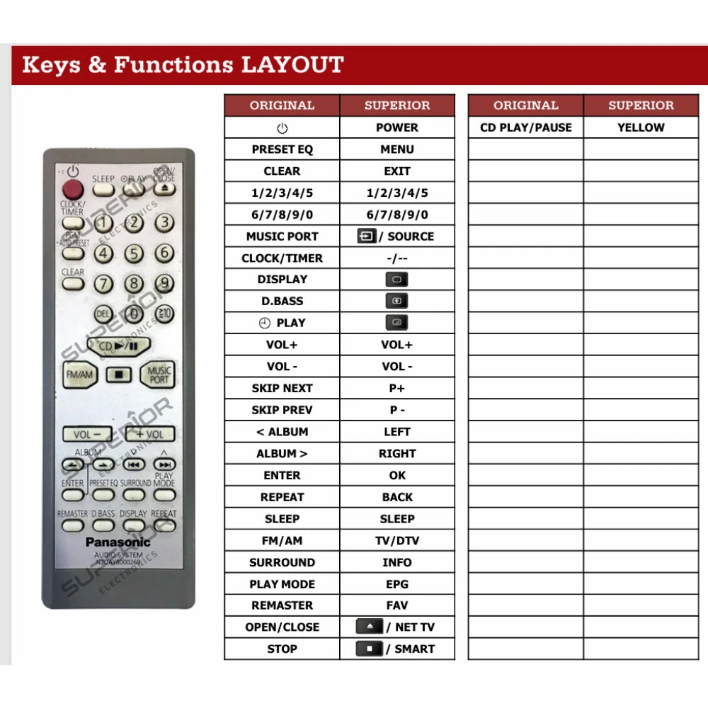 Darüber hinaus ist dieses Modell möglicherweise auch mit weiteren, hier nicht explizit aufgeführten Panasonic-Geräten kompatibel. Bitte beachten Sie: Sie erhalten eine hochwertige Fernbedienung der Marke Superior, nicht das Original des Herstellers. Die genaue Belegung entnehmen Sie bitte dem detaillierten "Keys & Functions LAYOUT"-Bild in der Produktgalerie.