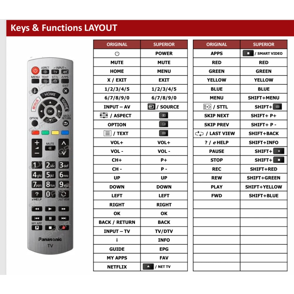Darüber hinaus ist dieses Modell möglicherweise auch mit weiteren, hier nicht explizit aufgeführten Panasonic-Geräten kompatibel. Bitte beachten Sie: Sie erhalten eine hochwertige Fernbedienung der Marke Superior, nicht das Original des Herstellers. Die genaue Belegung entnehmen Sie bitte dem detaillierten "Keys & Functions LAYOUT"-Bild in der Produktgalerie.