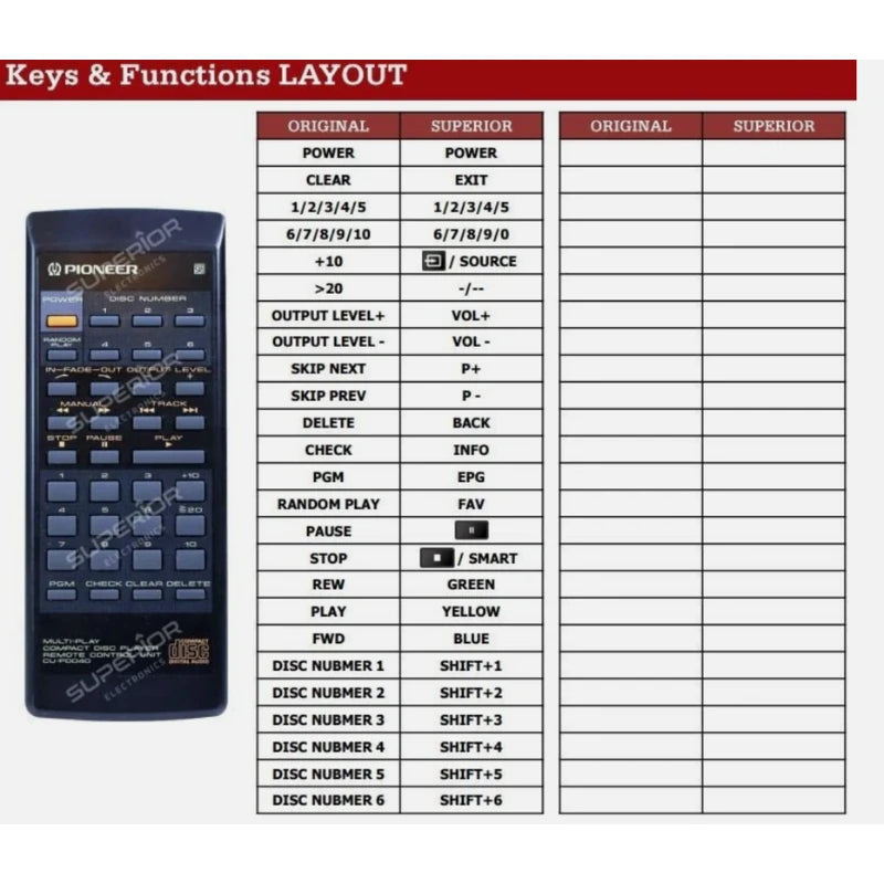 Ist die originale Steuerung (Modell CU-PD040) für Ihren Pioneer 6-fach CD-Wechsler defekt oder verloren gegangen? Dieses Modell wurde als idealer Ersatz entwickelt und ist vollständig kompatibel mit den Modellen: PD-M40, PD-M403, PD-M410, PD-M423, PD-M426, PD-M427, PD-M430, PD-M435, PD-M450, PD-M453 und PD-M455. Darüber hinaus ist dieses Modell möglicherweise auch mit weiteren, hier nicht explizit aufgeführten Pioneer-Geräten kompatibel. Bitte beachten Sie: Sie erhalten eine von uns speziell für Ihr Gerät programmierte, hochwertige Fernbedienung der Marke Superior, nicht das Original des Herstellers.