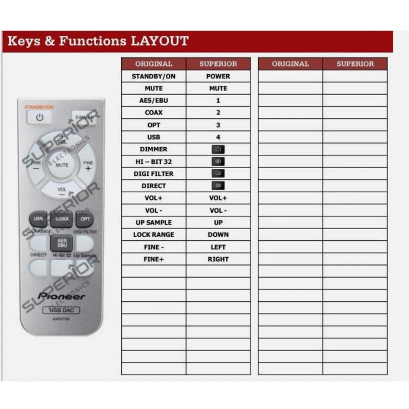 Ist die originale Steuerung (Modell AXD7730) für Ihren Pioneer U-05 Kopfhörerverstärker & DA-Wandler defekt oder verloren gegangen? Dieses Modell wurde als idealer Ersatz entwickelt und ist vollständig mit dem Pioneer U-05 kompatibel. Darüber hinaus ist dieses Modell möglicherweise auch mit weiteren, hier nicht explizit aufgeführten Pioneer-Geräten kompatibel. Bitte beachten Sie: Sie erhalten eine von uns speziell für Ihr Gerät programmierte, hochwertige Fernbedienung der Marke Superior, nicht das Original des Herstellers.
