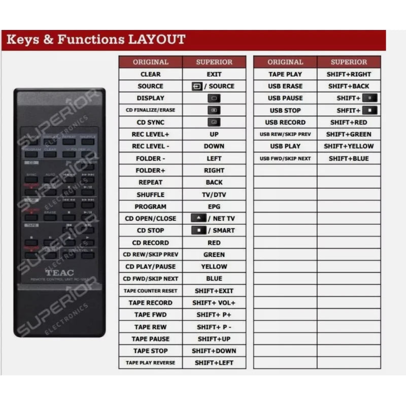 Der größte Vorteil ist die kinderleichte Handhabung. Im Gegensatz zu Universal-Modellen entfällt die Suche nach Codes oder das Lesen komplizierter Anleitungen. Legen Sie einfach Batterien ein, und sie ist sofort mit Ihrem TEAC-Kombideck verbunden. Alle Funktionen, die Sie vom Original kennen, sind vollständig verfügbar. Die genaue Belegung entnehmen Sie bitte dem detaillierten "Keys & Functions LAYOUT"-Bild in der Produktgalerie.