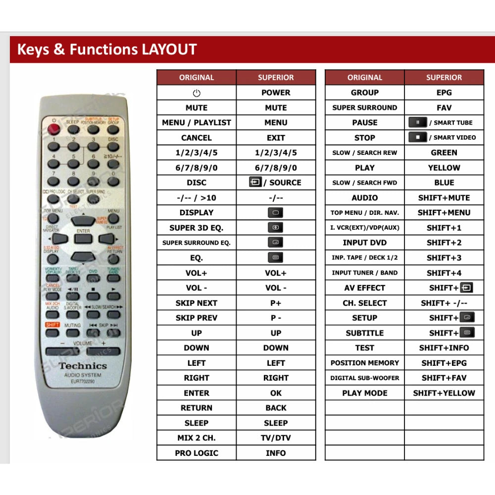Darüber hinaus ist dieses Modell möglicherweise auch mit weiteren, hier nicht explizit aufgeführten Technics-Geräten kompatibel. Bitte beachten Sie: Es handelt sich um eine voll kompatible, vorprogrammierte Ersatzfernbedienung, nicht um das Original des Herstellers. Die genaue Tastenbelegung, falls sie von Ihrem Original abweicht, entnehmen Sie bitte dem detaillierten "Keys & Functions LAYOUT"-Bild in der Produktgalerie.
