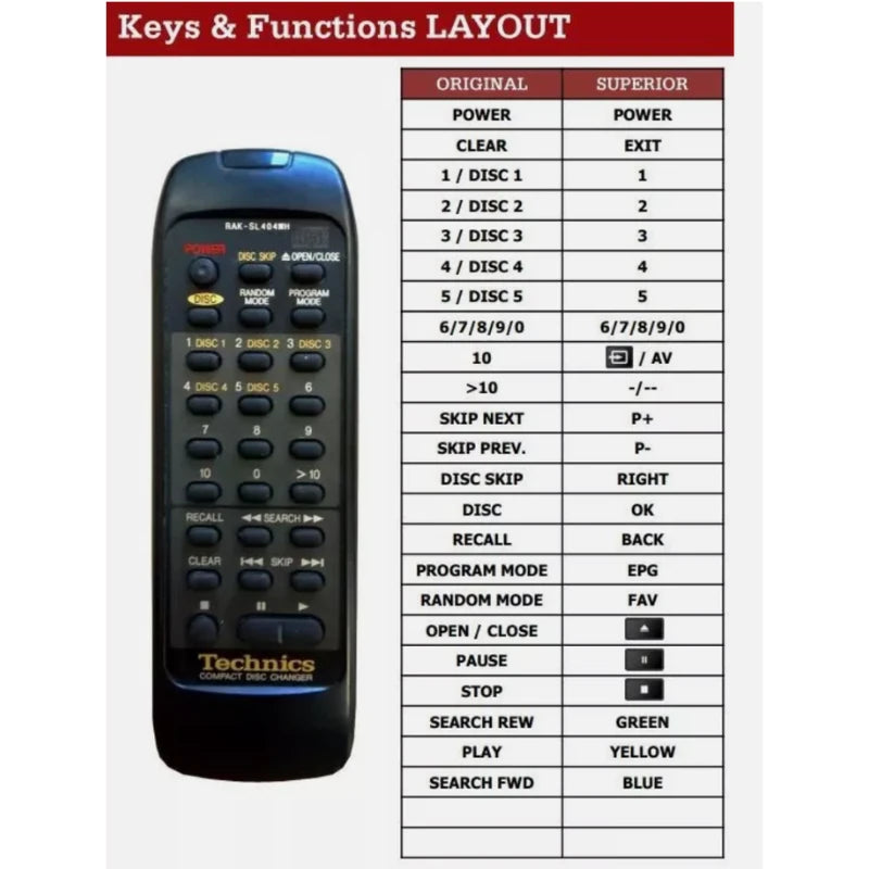 Ist die originale Steuerung (Modell RAK-SL404WH) für Ihren Technics CD-Wechsler defekt oder verloren gegangen? Dieses Modell wurde als idealer Ersatz entwickelt und ist vollständig kompatibel mit den Modellen: SL-PD845 (SLPD845), SL-PD887 (SLPD887), SL-PD688, SL-PD787 und SL-PD788. Darüber hinaus ist dieses Modell möglicherweise auch mit weiteren, hier nicht explizit aufgeführten Technics-Geräten kompatibel. Bitte beachten Sie: Sie erhalten eine von uns speziell für Ihr Gerät programmierte, hochwertige Fernbedienung der Marke Superior, nicht das Original des Herstellers.